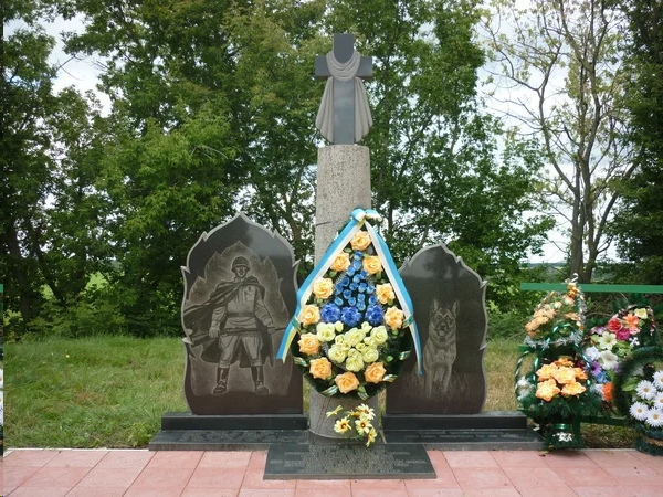 «Остановись и поклонись. Здесь в июле 1941 года поднялись в последнюю атаку на врага бойцы Отдельной Коломийской пограничной комендатуры — 500 пограничников и 150 их служебных собак и полегли смертью храбрых в том бою. Они остались навечно верными присяге и родной земле»